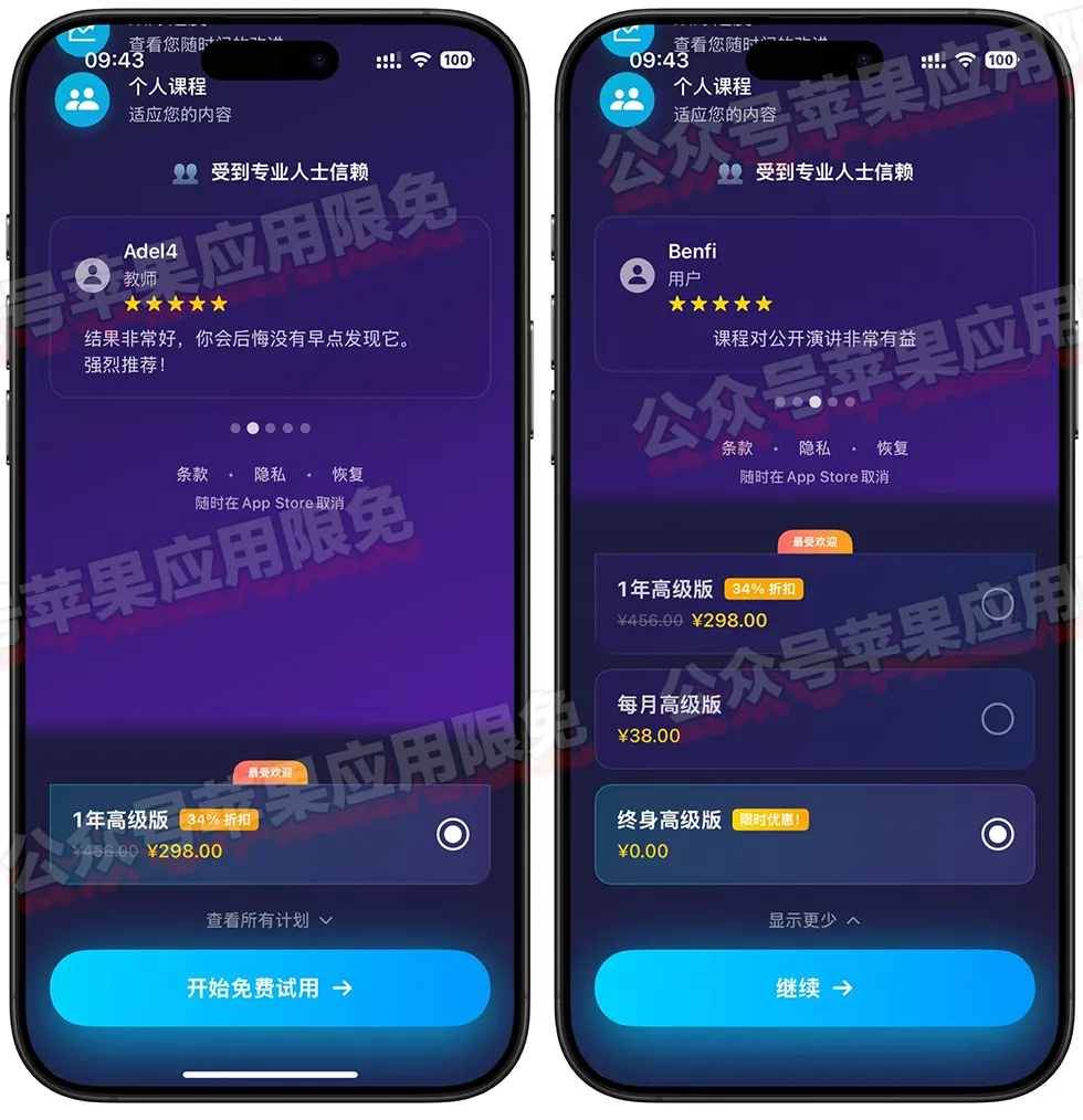 一款英语学习软件,目前可以免费获取它的终身订阅,打开软件就会弹出内购,点击查看更多计划,终身显示0即可免费获取,软件需要iOS 16.6 或更高版本