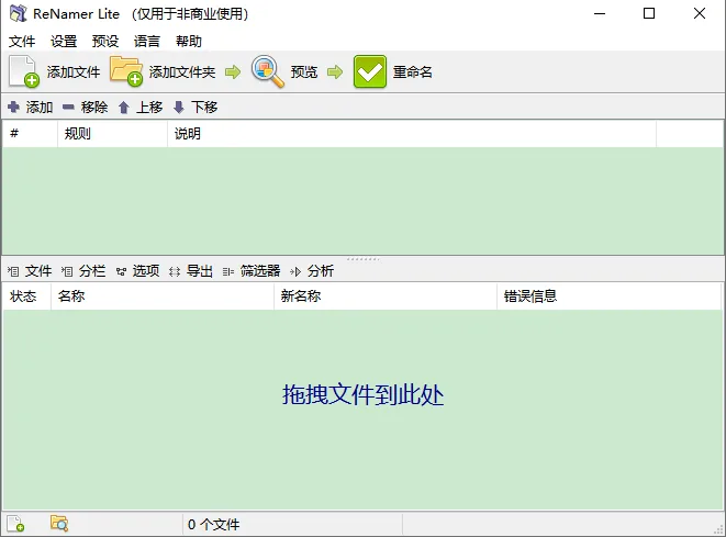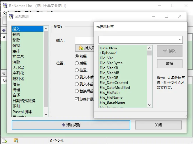 规则集,并按逻辑顺序应用每个操作,这些规则集可以被保存、加载和在程序内管理。此外,它还可以重命名文件夹,支持 Unicode 字符,并能识别多种元数据标签,如:ID3v1、ID3v2、EXIF、OLE、AVI、MD5、CRC32 和 SHA1。