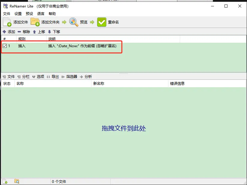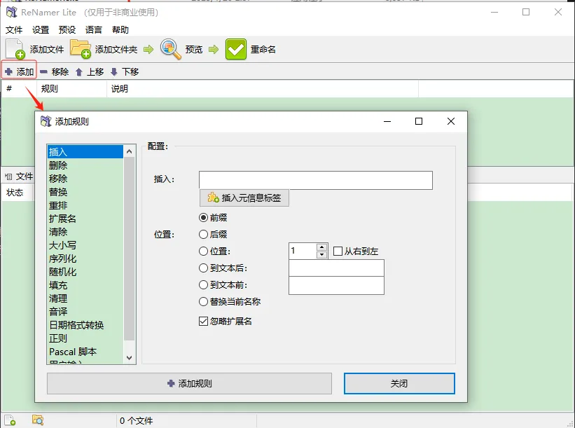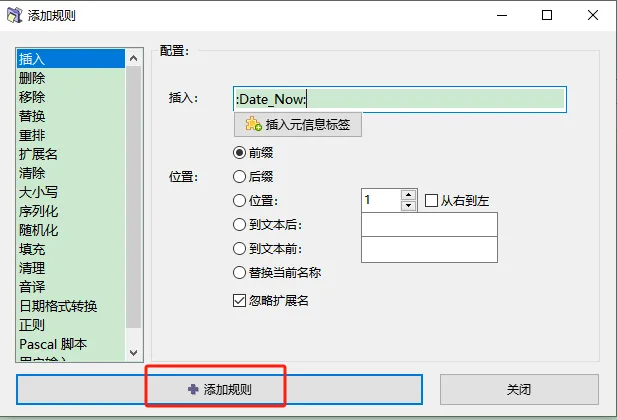 首先添加文件重命名规则,选择添加按钮然后弹出添加规则的对话框