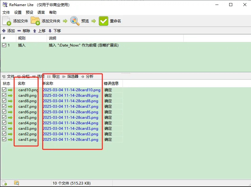 这里我们给10个图片文件文件名批量增加日期的方式 演示功能