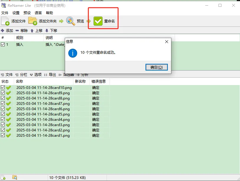 接着我们点击重命名按钮系统就自动进行文件重命名了,具体如下图: