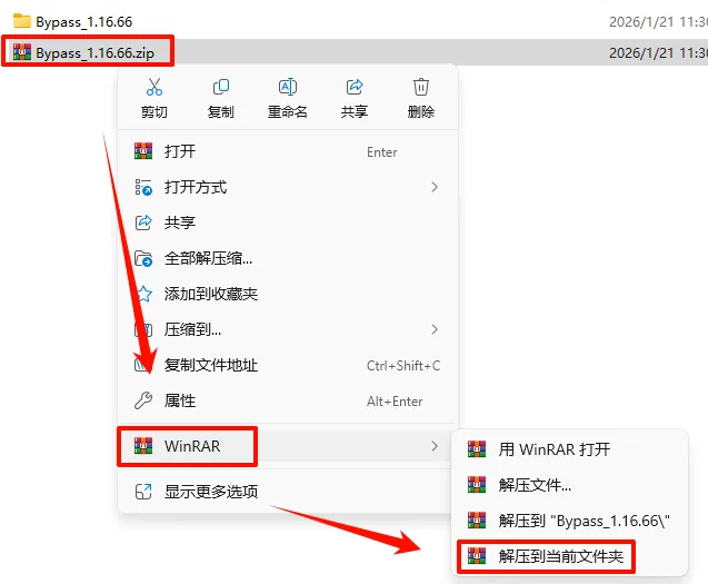 1.选中下载的压缩包,然后鼠标右键选择“解压到当前文件夹”(没有解压选项点这里)
