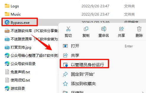 2.打开刚刚解压的文件夹,鼠标右击“Bypass.exe“选择“以管理员身份运行”(如有其他问题可以查看安装包里面的“使用须知”文档)