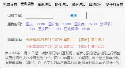 温馨提示:抢票成功后,需要在10分钟内完成支付,所以抢票前最好设置一下通知(QQ通知,邮件通知,微信通知)