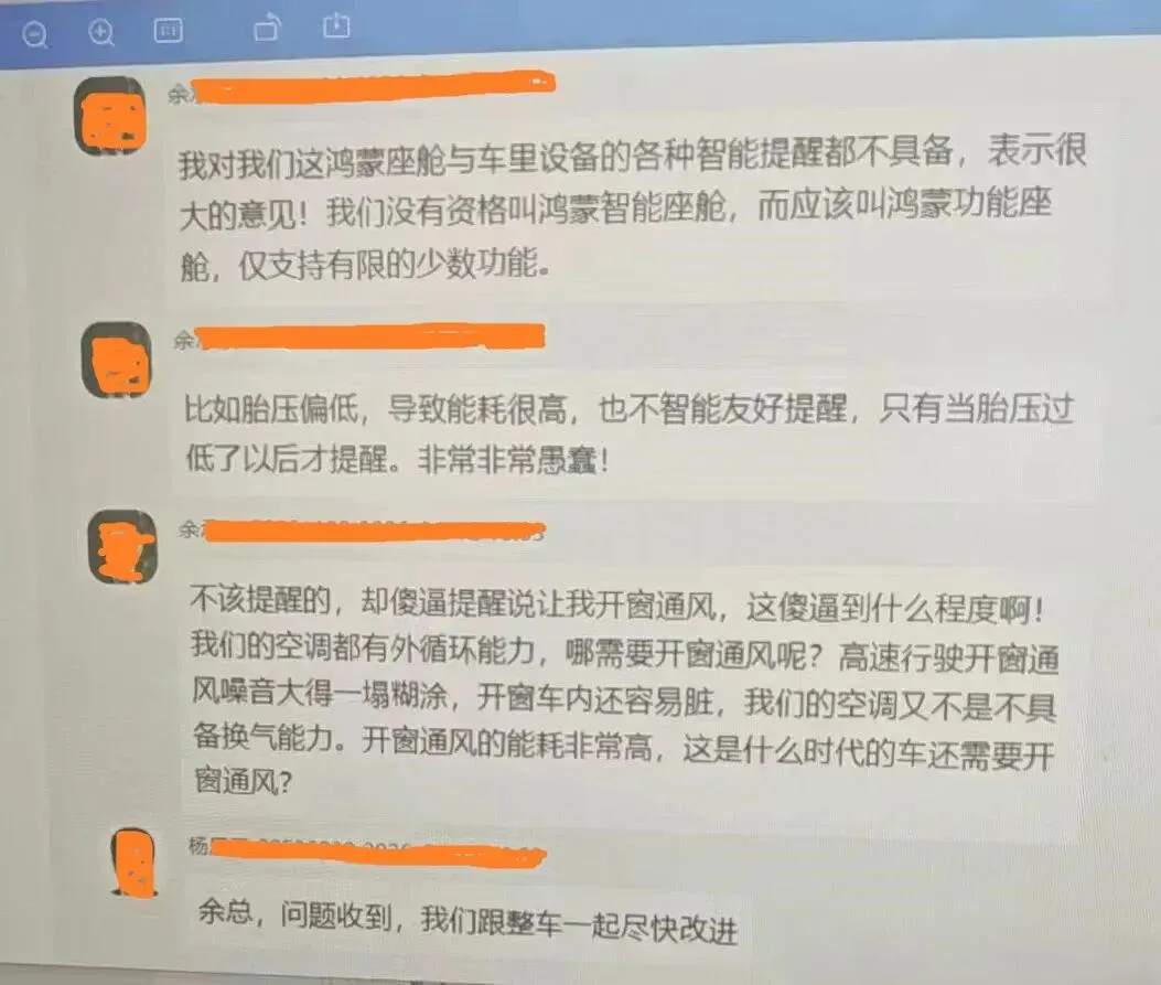 稍微了解华为的人都知道,它的内部信息管控严到什么程度—— 员工电脑 U 盘禁用、工作群消息禁止外传、核心项目文档层层加密,就连普通员工想转发一条部门通知,都得走审批流程。可这次,余承东批评鸿蒙座舱的聊天记录,连发送时间、人员备注都清晰可见,就这么堂而皇之地出现在各大科技群、社交平台,甚至没有打任何马赛克。(为防止侵权,本文图片已经特殊处理)