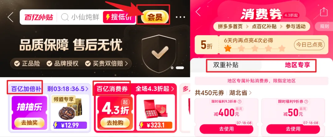 另外,在百亿补贴专场中还有额外的“百亿消费券”等你来领取,日常仍可领店铺优惠+平台消费券+地区补贴消费券。它可以在日常活动价的基础上,商家的折扣和平台优惠券叠加使用,并且结算时自动计算最优的叠券方案,直接让你折上折,就问你香不香!?在拼多多百亿补贴专区购买东西,丝毫不用担心质量问题,百亿补贴全场商品都有商品品质保险,假一赔十,放心下单就完事了!最后再提醒大家一句,拼多多年货节部分爆款库存告急,限时5折优惠,手慢真的会无!
