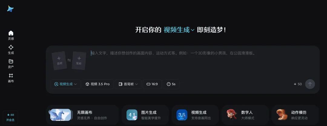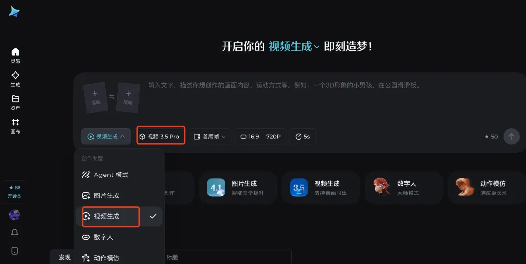 选模式:首页点击“视频生成”,勾选“视频3.5pro”;