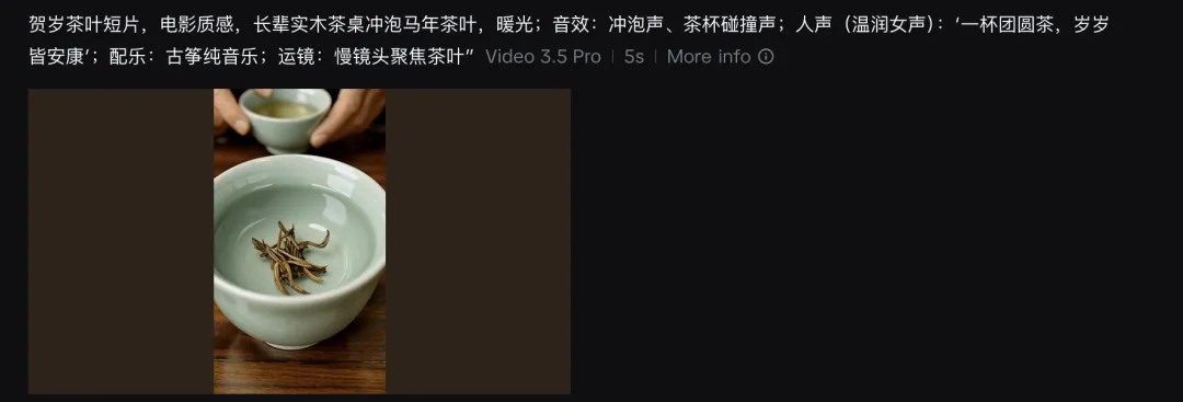 操作:输入提示词:“贺岁茶叶短片40秒,电影质感,长辈实木茶桌冲泡马年茶叶,暖光;音效:冲泡声、茶杯碰撞声;人声(温润女声):‘一杯团圆茶,岁岁皆安康’;配乐:古筝纯音乐;运镜:慢镜头聚焦茶叶”。