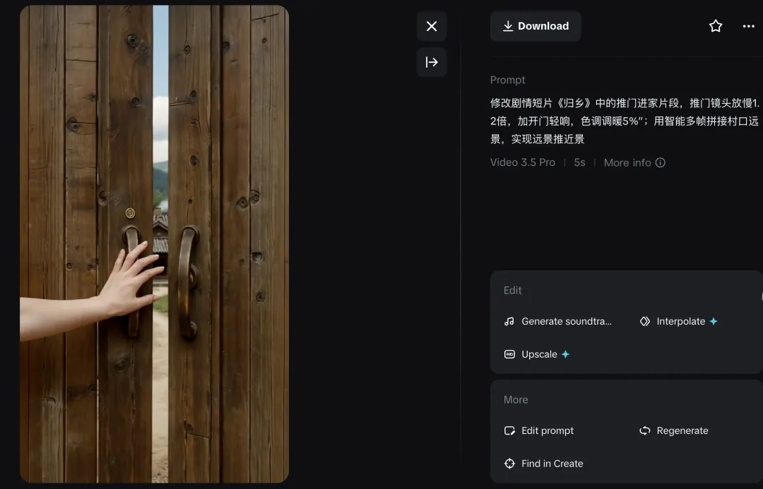 操作:先生成基础短片,输入修改指令:“推门镜头放慢1.2倍,加开门轻响,色调调暖5%”;用智能多帧拼接村口远景,实现远景推近景。
