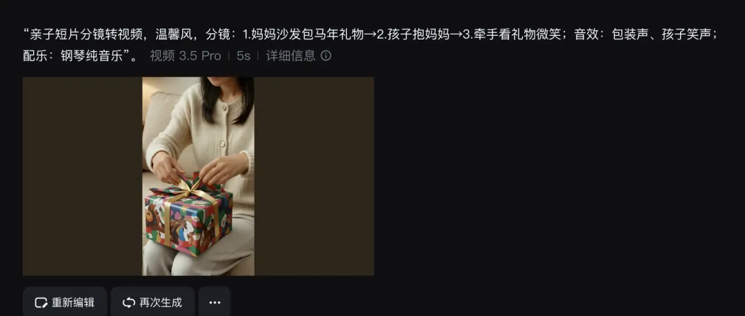 操作:输入提示词:“亲子短片分镜转视频,温馨风,分镜:1.妈妈沙发包马年礼物→2.孩子抱妈妈→3.牵手看礼物微笑;音效:包装声、孩子笑声;配乐:钢琴纯音乐”。