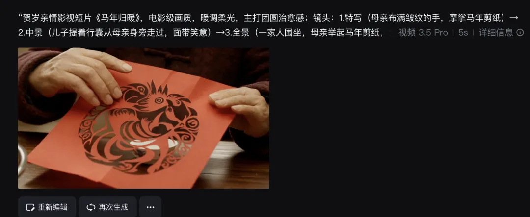 输入提示词(直接抄,影视感拉满):“贺岁亲情影视短片《马年归暖》,电影级画质,暖调柔光,主打团圆治愈感;镜头:1.特写(母亲布满皱纹的手,摩挲马年剪纸)→2.中景(儿子提着行囊从母亲身旁走过,面带笑意)→3.全景(一家人围坐,母亲举起马年剪纸,全员微笑对视);音效:推门声、轻柔的呼吸声、窗外零星鞭炮声;人声(温柔女声旁白):‘马年至,归期到,岁岁团圆,岁岁安暖’;配乐:舒缓大提琴独奏(音量轻柔,不盖过人声);运镜:缓慢推近,聚焦人物神态,无卡顿、无跳帧,画面细腻有层次感”;