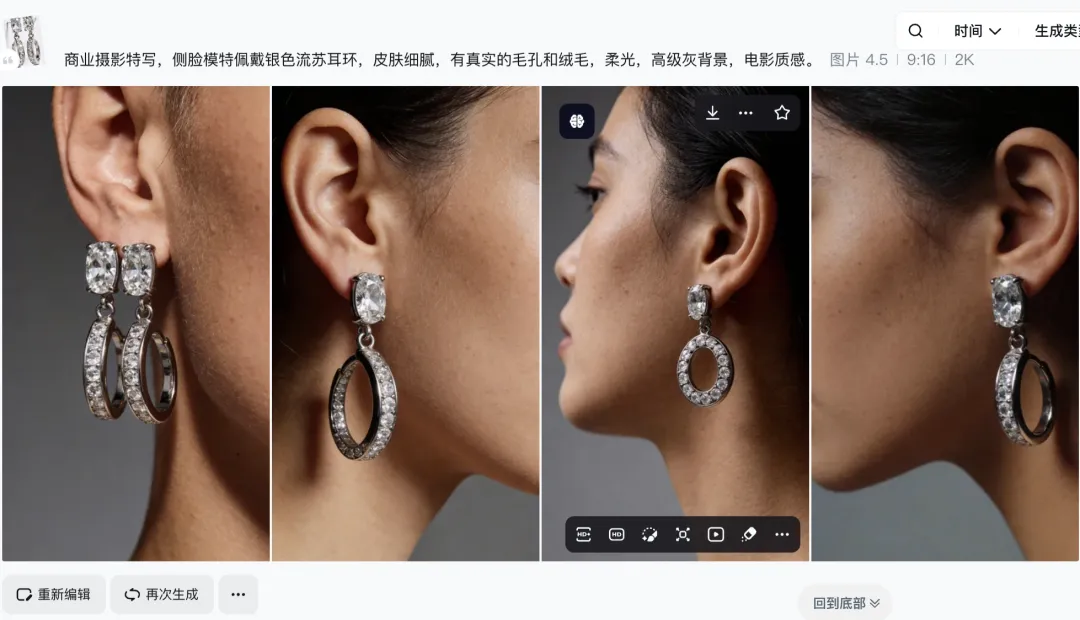 结果: 生成的模特耳朵结构完美,耳环的金属光泽和钻石火彩 1:1 还原。最绝的是皮肤质感,真实到连耳垂上的细微绒毛都清晰可见,完全不需要后期磨皮。