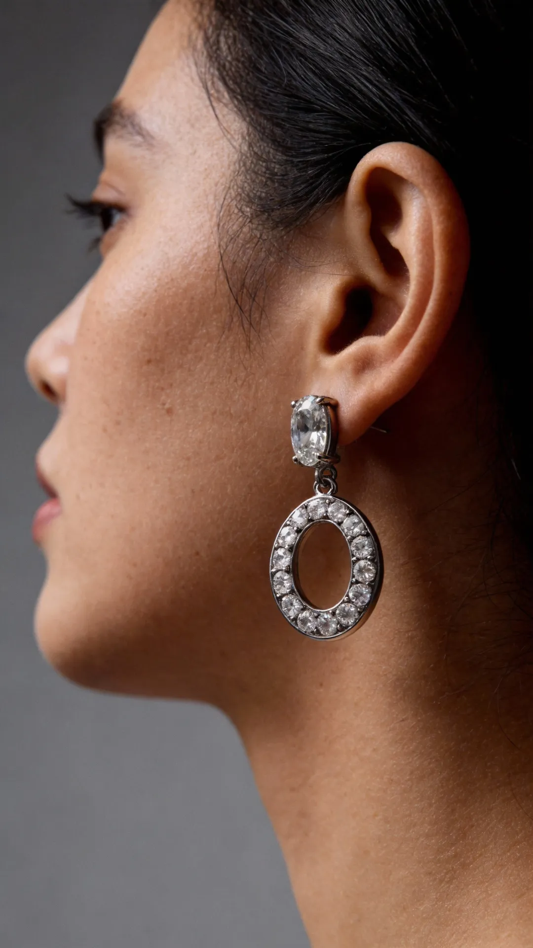 Prompt:商业摄影特写,侧脸模特佩戴银色流苏耳环,皮肤细腻,有真实的毛孔和绒毛,柔光,高级灰背景,电影质感。