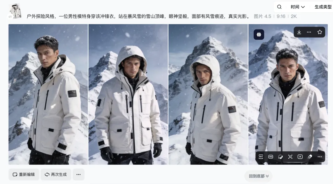 结果: AI 精准地把平铺图“穿”在了模特身上,衣褶自然,光影与雪山背景完美融合,完全看不出是合成的。