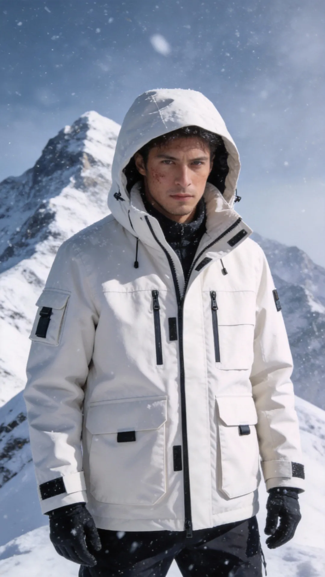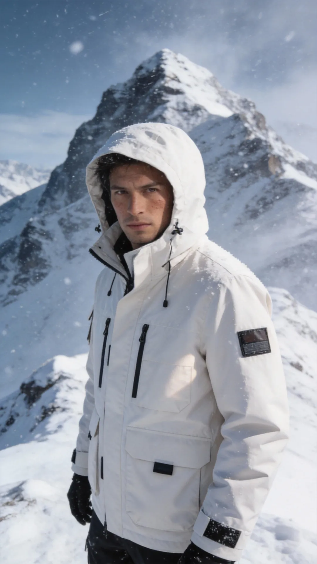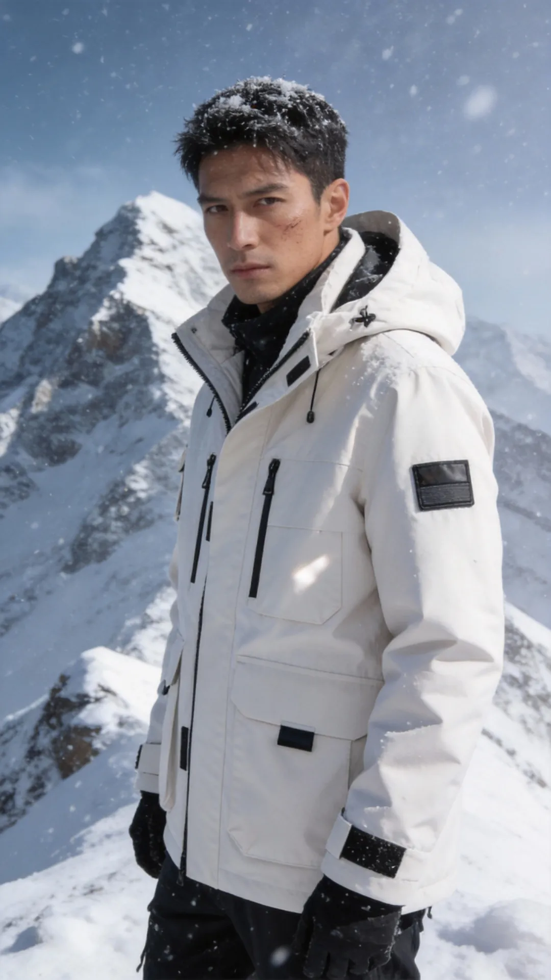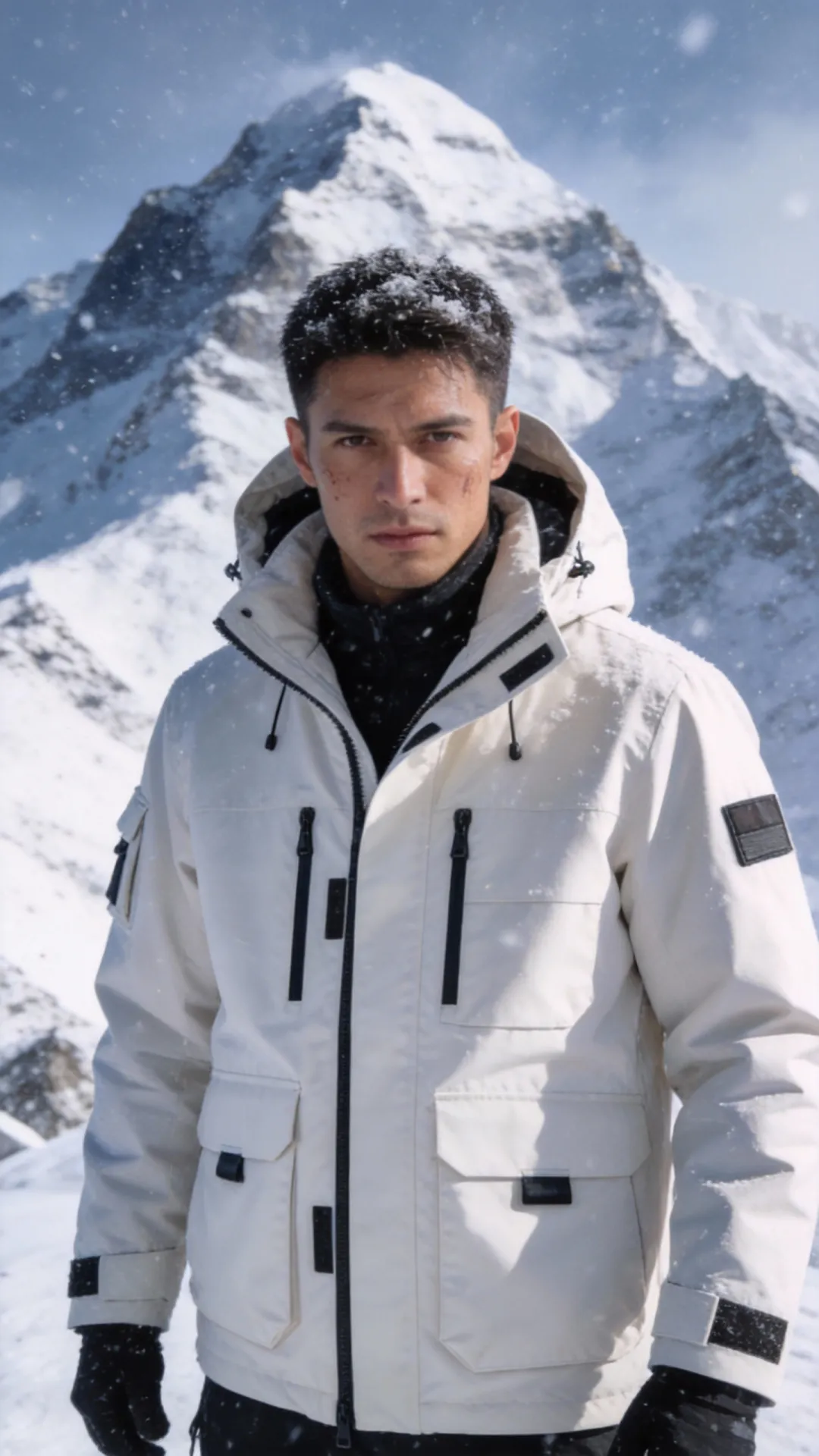 Prompt:户外探险风格,一位男性模特身穿该冲锋衣,站在暴风雪的雪山顶峰,眼神坚毅,面部有风雪痕迹,真实光影。