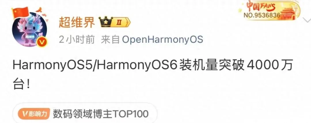 最新数据显示,鸿蒙系统的装机量已经正式突破 4000万 大关。
