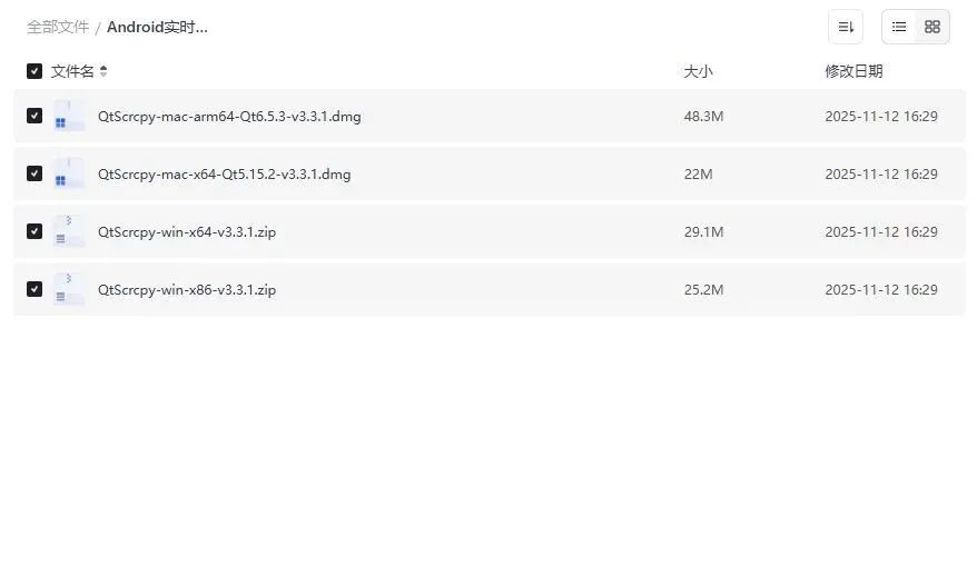- Mac M1/M2芯片 → QtScrcpy-mac-arm64-Qt6.5.3-v3.3.1.dmg