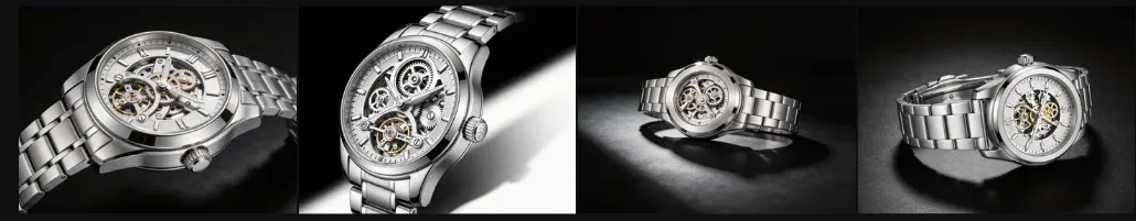 极简商务风,黑色背景,一枚银色机械腕表平放,表盘镂空露出齿轮,