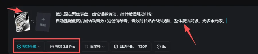 用即梦“图生视频”功能,精准锁定腕表核心细节,一键生成5秒音画同步短片。