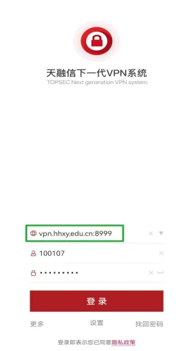 三、打开“天融信TopSAP”APP登录后最小化(登录方法不变,登录地址切换至“vpn.hhxy.edu.cn:8999”);