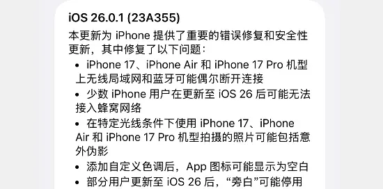 iOS 26.0.1 更新内容: