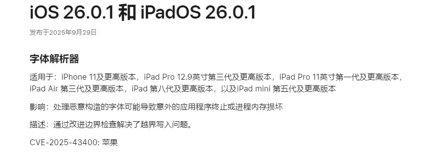 在苹果官网 iOS 26.0.1 安全内容中显示,本次更新只提交一个修补漏洞,该漏洞处理恶意构造的字体可能导致意外的应用程序终止或进程内存损坏。
