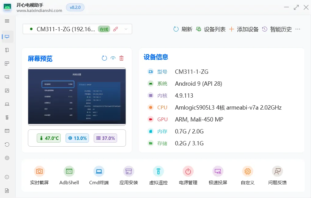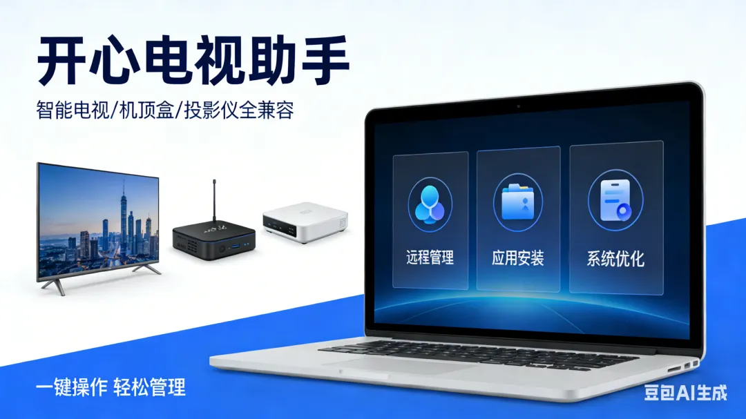 开心电视助手是一款专为安卓智能终端打造的远程管理工具,适配智能电视、网络机顶盒、家用投影仪等各类安卓设备,同时支持Windows、Mac、安卓手机/平板多平台操作,无需专业技术,就能帮助用户轻松实现设备管理、应用安装、系统优化等多种需求,是普通用户便捷使用、进阶用户深度折腾设备的实用辅助工具。