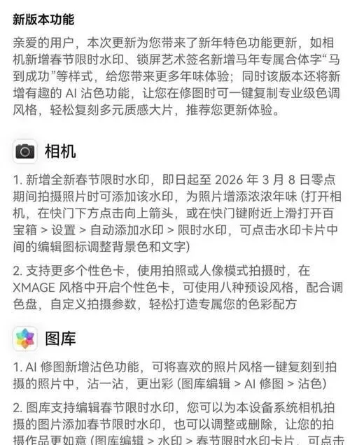 底层搭载2026年1月安全补丁,更新包完成后自动清除,避免冗余占用。华为此举体现出明显的长期布局意图:< strong>系统不仅是一个软件平台,更成为日常生活的仪式容器。年轻用户看中的是创意功能,中老年群体则偏好喜庆图标与易上手交互。