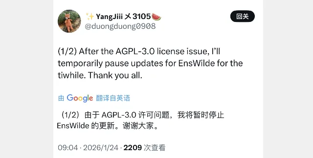 在1月24日上午时段,YangJiii 开发者带来一条不好消息,那就是 EnsWilde 工具将暂时停止更新,由于 AGPL-3.0 许可的问题,将无法继续更新。