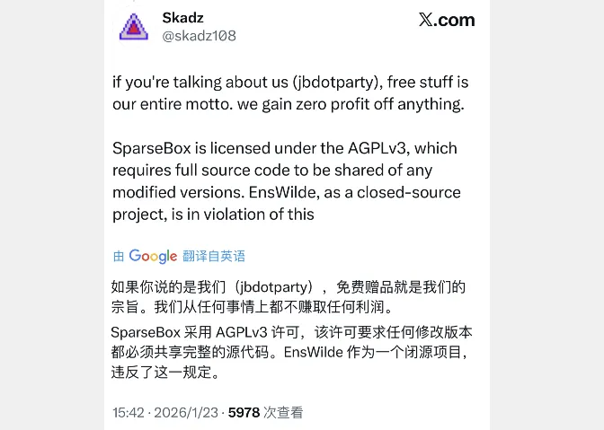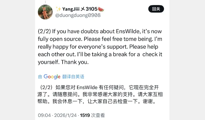 YangJiii 得知此事后,在1月23日下午时段针对 EnsWilde 项目进行开源,也就是说,现在所有人都能对此项目进行二改,毕竟已经开源了,你完全可以编译它。