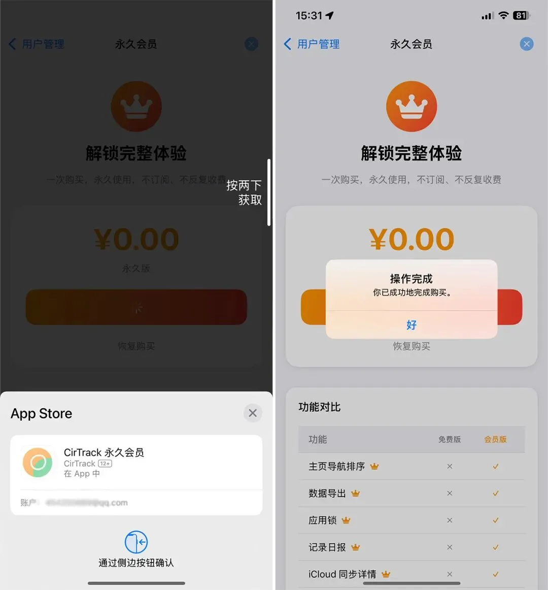 1,打开 App,按引导一步步继续,进入内购页面。2,内购界面,选择 Lifetime¥0.00 选项,点击下方按钮进行购买。