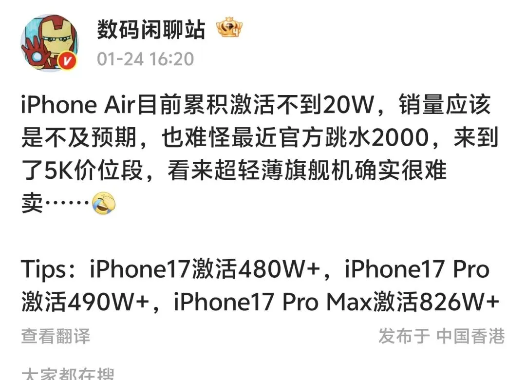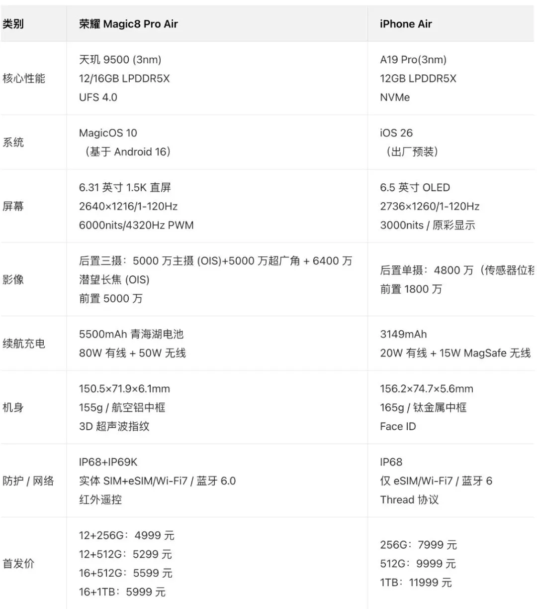 最近有两款个人觉得有意思的新机,分别是「荣耀Magic8 Pro Air」和「真我Neo8」,跟大家一起聊聊。在此之前,已经有些厂商跟着iPhone发了Air产品,但各种 Air 看下来,绝大部分都是蹭「Air」这个概念和热度。每次看到它们这200多克的重量和超过75mm的机身宽度,也不知道是如何恬不知耻的加上「Air」这个名字的。只有荣耀Magic8 Pro Air确确实实是在用iPhone Air的产品思路来做Android Air,它的机身宽度、整机重量对比iPhone Air不遑多让。而在此基础上,它的电池、影像、扬声器、充电、信号等核心硬件几乎全面领先iPhone Air,处理器则是联发科旗舰天玑9500,我觉得是目前最值得称得上 Air 的产品,或者说,对标iPhone Air最成功的产品。一直以来我都是用的大屏手机,现在是越来越想换个轻一点的、窄一点的中屏手机了。尤其是武汉前几天下雪大降温。大冬天的躺在被窝里玩手机,这又厚又重的iQOO 15不管怎么拿都不舒服。举着玩手冷还容易砸脸,侧着玩对眼睛不好,属实没招了。之前说看中了REDMI K90,现在的荣耀Magic8 Pro Air也不错。不过客观来说,用户和数码博主吹嘘甚至购买iPhone Air的时候,到底是他们需要「Air」还是需要「iPhone」,这是一个值得思考的问题,它决定着荣耀Magic8 Pro Air的销量。从现实情况来看,可能看上「iPhone」的还是要更多一些。就像vision Pro一样,苹果偶尔会用一些做工和设计很强但体验一般的产品,来挽救下它在果粉人心目中「高端」、「奢侈」、「有个性」、「能提供情绪价值和社交价值」的品牌形象。好消息是,由于iPhone Air销量远低于预期(截止目前国内累计激活量不到20W台,妥妥的网络热度遥遥领先于销量),因此上周五的时候,部分电商平台已经直降2000~2500元了(应该是近几年来iPhone降价最快的产品?),标准版起售价 5999 元,叠加国补价格来到 5499 元。第二台有意思的机型是「真我Neo8」,对标机型iQOO Z11 Turbo、一加Ace6T。它的亮点是在2500元价位段,拥有三星 1.5K 165Hz屏幕以及一加15旗舰同款的JN5 3.5X光学潜望长焦,并且带OIS光学防抖。三星JN5在4K价位段大家可能嗤之以鼻,但是在2.5K价位段做长焦还是有说法的。在这个价位段,要么主摄硬件好,比如Z11 Turbo,要么给个没有防抖的直立长焦,比如红米K90,而且这种风气是直到这一代才有的。过去这个价位段的产品思路,就是一加Ace6和Ace6T这种,给个5000万像素主摄+超广的经典扫码组合。对手机厂商来说,这些产品在性能和续航上都给你了,再给你上点影像硬件就有点过分了,影响挣钱。说到一加,每次真我的产品一出来,一加就十分尴尬,尤其是后面真我全面接入OPPO售后体系,最大的短板补齐,一加后面再不努努力提升产品力、做出自己的特色,搞不好就要在世子之争的比赛中落入下风。从一加15开始的几个产品,全都在压宝165Hz这个卖点,可能是试图重新复刻一加7 Pro 90Hz的巅峰时期;只是供应链的技术和发展,今时不同往日,现在竞争如此激烈,大家都在互相盯着,只要是供应链的技术,那短时间内跟进或者超越就不是太困难。因此一加15的165Hz甚至没撑住两个月就被荣耀WIN系列轻描淡写的185Hz一脚踹成路边,现在又被自家兄弟真我Neo8的三星165Hz薄纱,确实命苦。还有就是,屏幕刷新率从60Hz提升到90Hz、120Hz,确实能够带来非常明显的流畅度提升,但是再往上就抵达边际效应了,非特定场景下,用户感知不强。更别提现在手机系统和第三方应用绝大多数时候都是120Hz、个别厂商还在部分页面锁90、60Hz了。不得不提的是,大部分网友对这几台骁龙8 Gen5新机有个明显共识:「机器的外围配置都挺好的,如果处理器换成骁龙8 Elite就更好了」。怎么说呢,高通用骁龙8s Gen3和骁龙8s Gen4这两颗芯片已经把数码圈用户对骁龙中高端芯片的信任败光了。这次的骁龙8 Gen5尽管提升很大,零售机实测,CPU中低频场景性能和能效可以接近骁龙8 Elite,主要是缓存阉割和GPU大砍着实膈应,这一点不如天玑9500s良心。而且,差不多的价格就能上CPU缓存满配加上满血GPU的骁龙8 Elite,骁龙8 Gen5的价格确实不太吸引人。况且现在1800元就能拿下清库存的红米K80至尊版。不过俗话说得好,没有不好的产品,只有不行的价格;按照以往的规律,等到今年618或者双十一,这些骁龙8 Gen5新机的价格会有更多下降空间,届时产品力会继续提升。