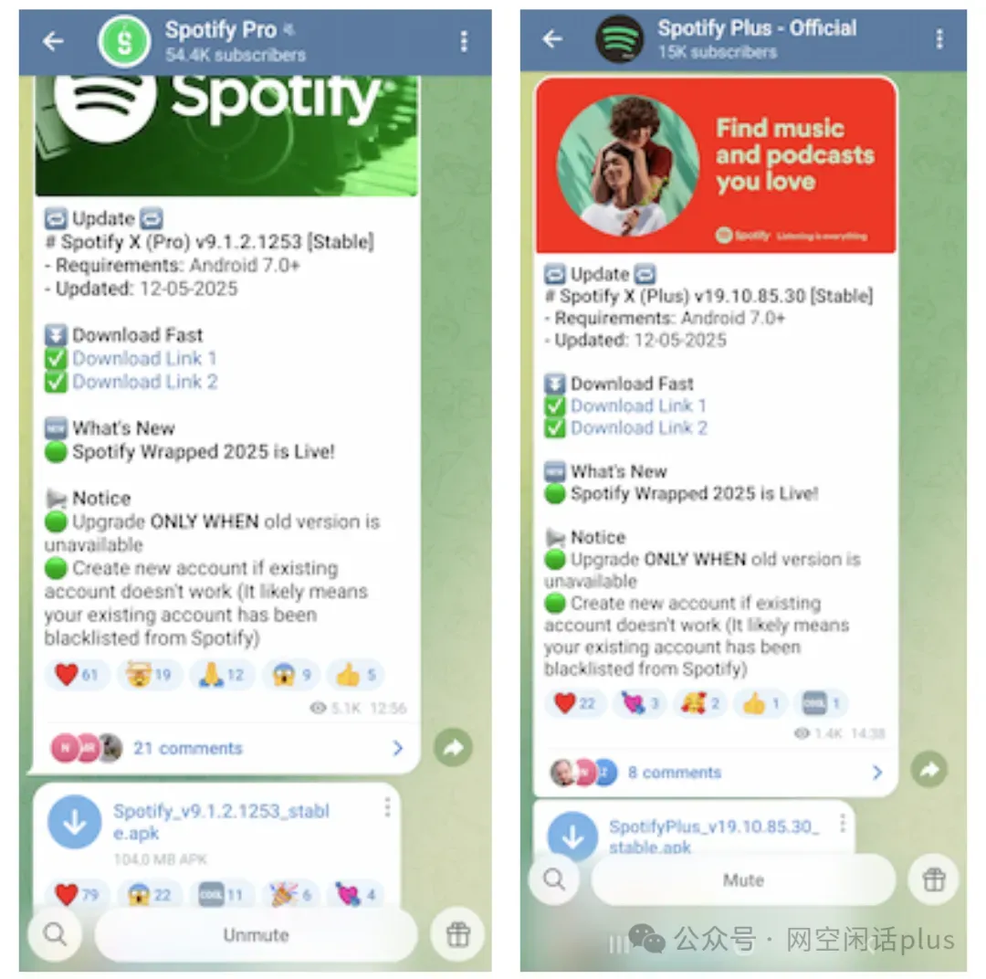 与此同时,Android.Phantom的传播重心仍然牢牢扎根于修改版应用生态。Spotify、YouTube、Deezer、Netflix等热门应用的解锁版,被广泛投放在专门的MOD网站、Telegram频道和Discord服务器中。Dr.Web指出,Moddroid网站“编辑精选”专区列出的20个应用中,只有4个是安全的,其余16个均检测到Android.Phantom木马,且这些应用来自同一个CDN服务器cdn[.]topmongo[.]com。