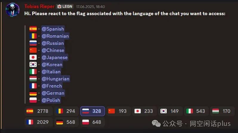 上面这张服务器截图显示了受感染用户使用的语言。要访问英语以外的其他语言聊天,您需要使用相应的标记进行操作。
