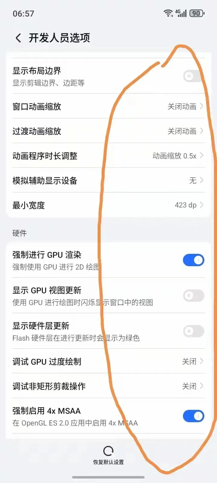 第二个设置:开强制GPU渲染。在开发者选项里找这个功能,有的品牌叫“硬件加速渲染”,打开开关就生效。实测大型应用启动加载时间缩短12%,图形加载速度快55%。因为默认状态下,CPU要同时处理运算和图形渲染,开启后图形任务交给GPU,GPU处理效率比CPU高10倍以上,能降低40%的CPU占用率。注意,2023年前的老应用可能闪退,闪退了就关掉这个功能。