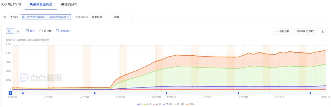 2、中期深化:通过点点数据筛选行业高价值关键词,建立统一的动态关键词库,但实施差异化应用。为App Store筛选出精炼、高转化的关键词填入有限字段;为Google Play则部署更丰富的长尾词与场景词于描述中。同时借助ASO关键词优化提升商店曝光,结合版本更新,持续为双平台注入新的流量来源。