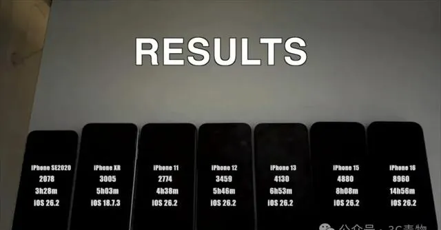 先聊结论,iOS 26.2的续航,部分老款iPhone是真的不比旗舰强了。以这次iAppleBytes的实测为例,7款iPhone统一标准测试,数据一出来,多少有点“泼冷水”。像iPhone 11,原本iOS 26.1还能撑到5小时20分钟,升级26.2后直接跌到4小时15分钟,降幅接近20%,夜跑、地铁通勤,电量焦虑直接拉满。iPhone 12表现稍好一些,从6小时10分钟掉到5小时30分钟,但40分钟的差距,日常用下来也能感觉到“心里没底”。iPhone XR的续航也没能幸免,实测5小时3分钟,比老大哥11还稳一点,毕竟电池得分从2806涨到3005,算是个小惊喜,建议升级。至于iPhone 13、15、16这三款,数据就有分化了——iPhone 13续航6小时53分钟,电池得分直接从3130飙到4130,升级后体验更流畅,主摄夜拍清晰,防抖表现出色,AI算法对画面调色也更自然。iPhone 15虽然实测8小时8分钟,理论上续航还行,但电池得分反而从5799降到4880,这点就比较尴尬,升级后可能会体感“虚标”,而iPhone 16则是直接14小时56分钟,电池得分8960,妥妥的续航王者,升级无压力。