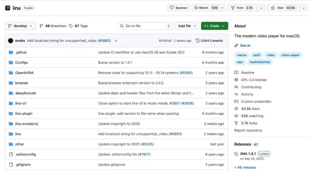我自己的主力电脑是Apple M4 Max,工作上使用widnows都是在Parallels Desktop的虚拟机上。今天开始开一个macOS软件推荐专栏,推荐的都是我在用的macOS软件,绝大部份是开源或破解版,少部份少量收费。今天登场的就是我们的主角IINA播放器,开源软件,纯免费,在Github上获得了34.5K星。