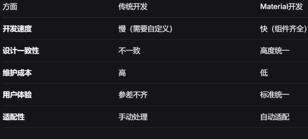 Material Design让开发者像搭积木一样构建应用,提供了一套完整的、美观的、可交互的UI组件,让你专注于业务逻辑,而不是样式细节。