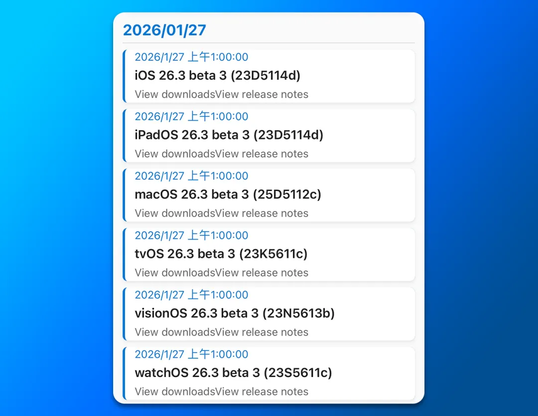 今天凌晨,苹果除了推送了 iOS 26.2.1 等大量正式版系统外,还向开发者推送了 iOS 26.3 Beta 3 等测试版的系统。