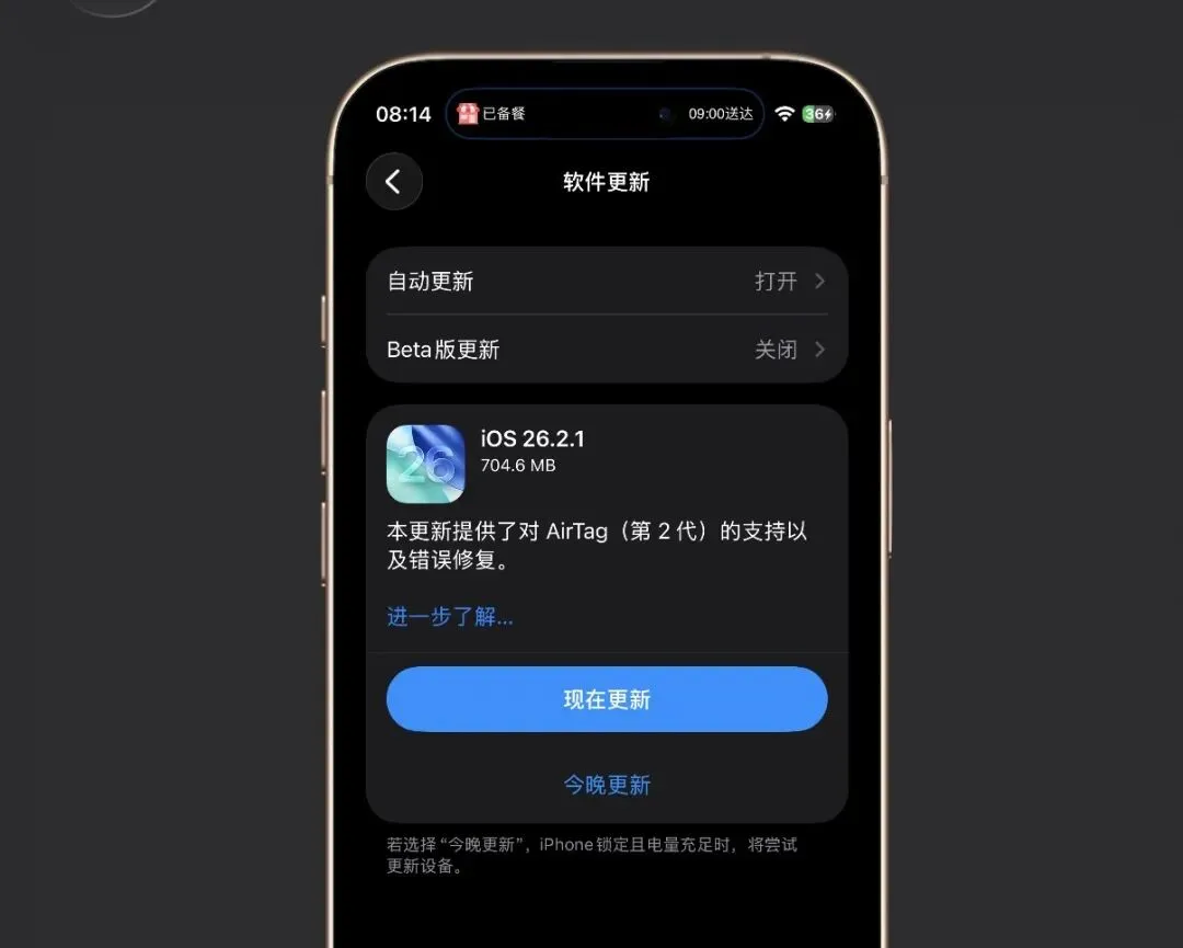 iOS 26.2.1 更新的版本号为23C71,主要是更新了对昨晚刚发布的 AirTag(第 2 代)蓝牙追踪器的支持以及 Bug 修复。