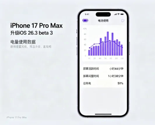 一位iPhone 17 Pro Max用户提供的数据显示,在升级到iOS 26.3 beta 3后,他的设备屏幕活跃时间为5小时44分钟,屏幕闲置时间1小时38分钟,耗电51%。
