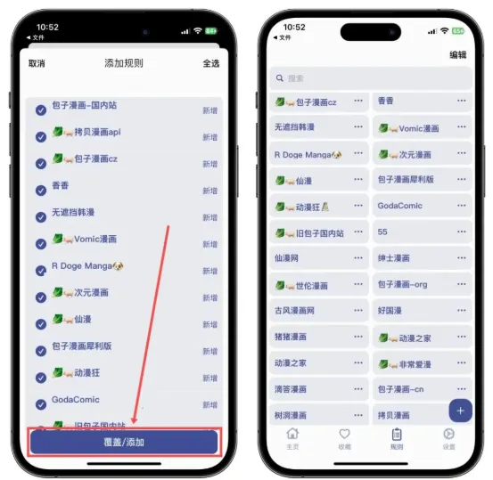 在软件里点击 **【覆盖 / 添加】**,100 + 漫画源规则就全部导入完成啦!