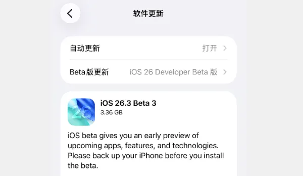 在 1 月 27 日凌晨 2 点整,苹果向开发者推送了 iOS 26.3 Beta 3 内测系统。