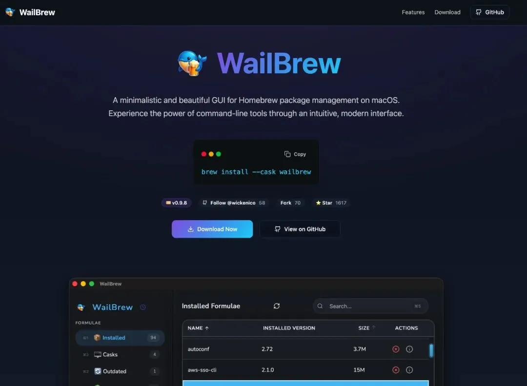 WailBrew 是一种现代且直观的 macOS 自制管理方式!它提供了一个干净的图形界面,使包管理对所有人都易于访问。通过 WailBrew 的界面,你可以:View and manage installed formulas and casks查看和管理已安装的formulas和casksSearch through packages with instant filtering搜索带有即时过滤功能的套餐Install, uninstall, and upgrade packages安装、卸载和升级软件包Check for outdated packages and update them individually or all at once检查包裹是否过时,单独更新或一次性全部更新View detailed package information including dependencies and conflicts查看包括依赖和冲突在内的详细包信息Manage Homebrew repositories (tap/untap)管理自制软件库(tap/untap)