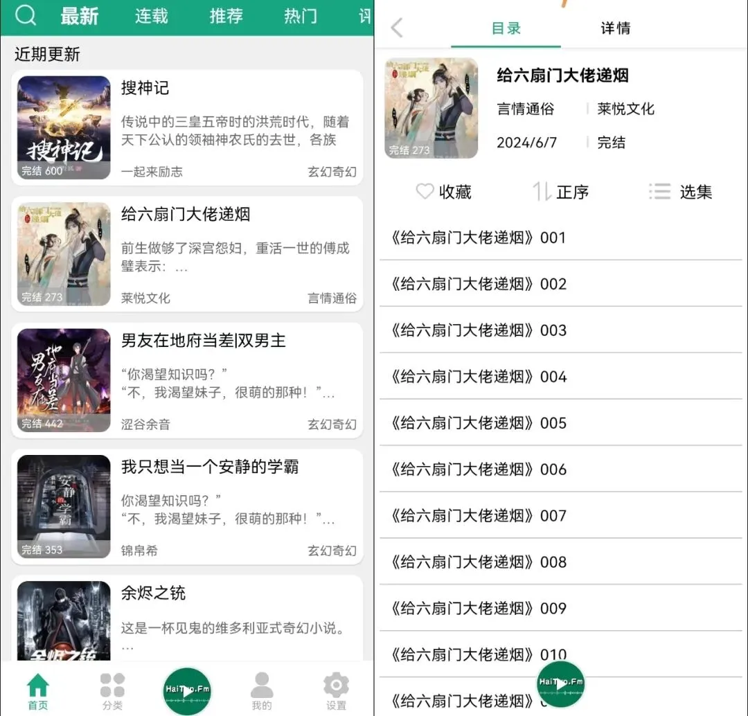 一款超棒的免费听书软件,海云听书的升级版,资源非常丰富,界面设计简洁清爽,功能结构清晰有序。首页上方有着推荐、更新、新书、男频、女频、广播剧等板块内容,分类明确,方便大家快速找到心仪的有声读物