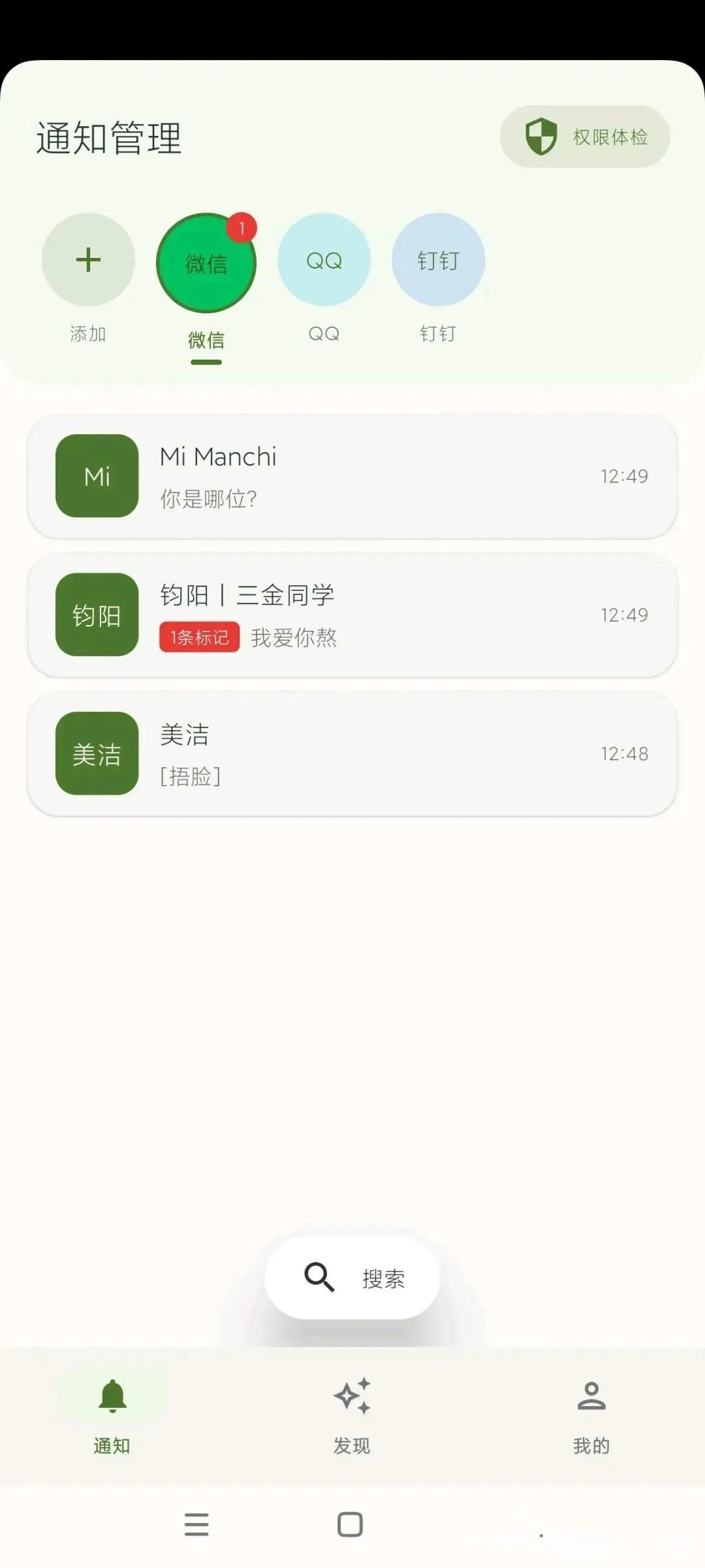 这款工具还能添加任意想要监测的软件,只要填好包名和软件名称就能添加成功。软件默认监测微信、QQ和钉钉,添加其他软件的话,记得给上通知权限,不然收不到对应通知,自然也就读取不到消息啦。