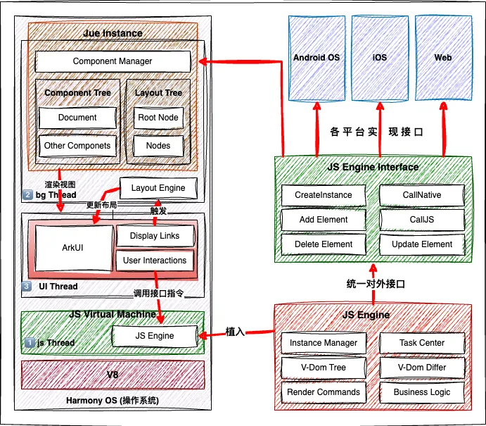 为了适配不同系统,通过制定统一的对外接口规范(JS Engine Interface)让不同平台按照标准化对接及扩展(比如这次华为鸿蒙系统的适配只需实现统一对外接口即可),接口包含了实例创建、生命周期、元素的增删改查、JS和原生的双向通讯、热重载交互等各种能力,各端按需实现。 鸿蒙系统上,Jue Instance 具体实现接口声明的方法,创建动态化页面和处理业务交互逻辑。提供内置基础标签和模块,同时打通了特殊业务场景下的标签和模块的扩展能力,业务可根据具体的业务场景扩充和完善。 在 JS Engine 环境中通过对视图元素的增删改查操作及其他相关指令构建出了一个组件树(后文统称 V-Dom Tree, 作为一个纯对象,可以清晰的提炼出视图元素的层级结构,这个抽象描述是与平台无关的,因此可在 JS环境中生成 V-Dom Tree),在原生端根据 V-Dom Tree 的结构创建出对应的 Render Tree,再经过布局引擎布局后,就显示出了业务具体的视图效果;由于通过统一接口实现了 JS 和原生的双向通讯,当用户在业务视图上触发了交互事件,或业务方需要改变视图显示的时候,都可通过统一接口顺利的完成事件和数据的交互逻辑以及业务视图的渲染。