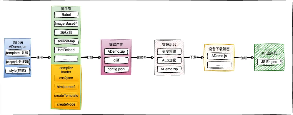 通过平台线上打包或者使用动态化提供的脚手架打包命令,将 ADemo.jue 打包成 ADemo.zip,通过资源管理平台下发至客户端设备,经过解压、解密等手段获取 ADemo.js 等文件,原生在合适的时候创建动态化视图,并通过 JS 虚拟机加载 ADemo.js 文件,从而开始视图绘制。动态化资源从打包到被 JS 虚拟机加载的流程图如下:下面我们来看一下 ADemo.js 文件的具体内容,截取主要代码如下:/******/ (function(modules) { })/************************************************************************//******/ ({/***/ "./src/jueDemoList/ADemo/ADemo.jue":/*!*******************************************!*\ !*** ./src/jueDemoList/ADemo/ADemo.jue ***! \*******************************************//*! exports provided: default *//***/ (function(module, __webpack_exports__, __webpack_require__) {"use strict";__webpack_require__.r(__webpack_exports__);var template = JRTemplateManager._jr_create_jue_template('ADemo.jue', { "id": "ADemo", "version": "11", "dependencies": { "JSEngine": "0.9.4" }});JRTemplateManager._jr_create_t_node('ADemo.jue', '0', '40e129af-5e6a-70b8-a757-28a22785dc2f', 'document', { "style": "border-width: 2px;"});JRTemplateManager._jr_create_t_node('ADemo.jue', '40e129af-5e6a-70b8-a757-28a22785dc2f', '918d8bb8-9362-bcd6-00ee-35b85c435072', 'div', { "class": "normalClass", "style": "margin-top: 100px;"});JRTemplateManager._jr_create_t_node('ADemo.jue', '918d8bb8-9362-bcd6-00ee-35b85c435072', '9e848985-59ac-bd8b-e85a-617a6e9a08dd', 'image', { "class": "normalClass", ":src": "imageUrl", "style": "height: 200;"});JRTemplateManager._jr_create_t_node('ADemo.jue', '918d8bb8-9362-bcd6-00ee-35b85c435072', 'b56d24a9-c08e-6b32-9558-162f2aece68d', 'div', { "class": "normalClass", ":style": "{'background-color':bgColor}", "style": "height:60px;"});JRTemplateManager._jr_create_t_node('ADemo.jue', 'b56d24a9-c08e-6b32-9558-162f2aece68d', '440bad33-f8bb-6baf-fe4f-b9bf768d4cc1', 'text', { "style": "border-width: 2px;width:260px;height:40px;align-self: center;text-align: center;background-color: white;", "@click": "change()"});JRTemplateManager._jr_add_t_node_value('ADemo.jue', '440bad33-f8bb-6baf-fe4f-b9bf768d4cc1', 'value', '更新节点数据');var __default__ = { data: function data() { return { bgColor: "white", imageUrl: "https://static.foodtalks.cn/company/images/434/121logo.png" }; }, mounted: function mounted() {}, methods: { change: function change() { this.bgColor = "red"; this.imageUrl = "https://www.szniego.com/uploads/image/20210202/1612232326.png"; this.updateInstance(); } }};template.script = __default__;__default__.filename = 'ADemo.jue';__default__.__template__ = function () { return template;};/* harmony default export */ __webpack_exports__["default"] = (__default__);template.globalStyle = {};template.style = { ".normalClass": { "margin": "10px", "justify-content": "center", "align-items": "center", "align-self": "stretch", "border-width": "2px" }};/***/ })/******/ });//# sourceMappingURL=ADemo.js.map
