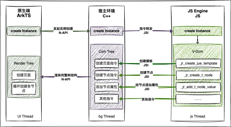 在鸿蒙端,进入动态化页面之前,确保资源文件(ADemo.js)已被加载到内存中后,由原生端(ArkTS)发起动态化实例的创建,调用动态化 SDK 提供的创建动态化实例(Instance)的方法,通过 N-API 调用宿主环境(C++)的具体实现,创建 C++ 环境下的 Instance。然后通过JSI(将C++ 中的常用类型与 JavaScript 中的类型一一对应,可互调方法和操作对象。从而消除了数据序列化和线程切换调用的开销,极大提升通讯性能)调用预置到 JS 虚拟机中的 JS Engine 的接口方法,创建 JS 环境下的 Instance。在 JS 环境中,收集页面信息,完成 V-Dom Tree 的创建,再通过 JSI 将页面数据传递给宿主环境(C++),根据 V-Dom 的结构创建组件树(Component Tree),再通过 N-API 将数据传递给原生,调用 ArkTS 构建对应的渲染树(Render Tree),完成视图绘制。上图展示了动态化在鸿蒙端绘制页面的过程,总结一下就是三种语言环境,三个 Instance,三个 Thread 。三个 Instance 独立且一一对应。ArkTs 中的 Instance 在 UI 线程中用来完成页面的绘制,数据的绑定和事件的触发等。C++ 中的 Instance 作为数据的中转存储和事件转发,在 bg Thread 处理复杂耗时的逻辑,避免阻塞 UI Thread 和 js Thread。JS 中的 Instance 负责搜集产物信息,构建 V-Dom Tree,传递数据和事件等都在 js Thread 中处理。C++ 和 ArkTs 中根据 V-Dom Tree 创建 Component Tree 和 Render Tree。